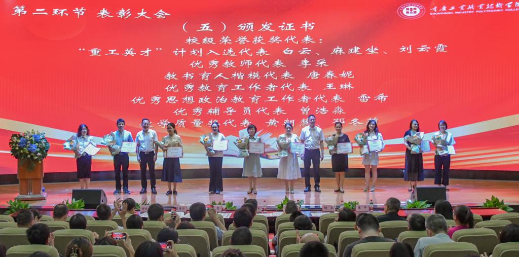 躬耕教坛,强国有我。在第39个教师节来临之际,9月8日下午,重庆工业职业技术学院2023年教师节暨表彰大会在第一学术报告厅隆重举行。学校党委书记郭天平以及全体在家党委委员、副科级以上干部(含教研室主任)、获奖教师代表、学生代表等近500人,欢聚一堂,共庆佳节。大会由党委副书记张荣主持。