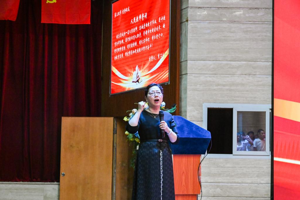 图为游敏作为学生代表向全体教师送上节日祝福,她表示,将时刻铭记师恩,在未来学习道路上,继续刻苦学习不断突破自己,努力成为新时代接班人