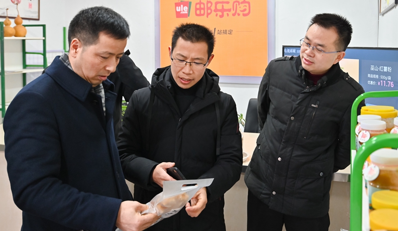 学校院长郭天平一行在洞桥村了解电商平台运营情况。