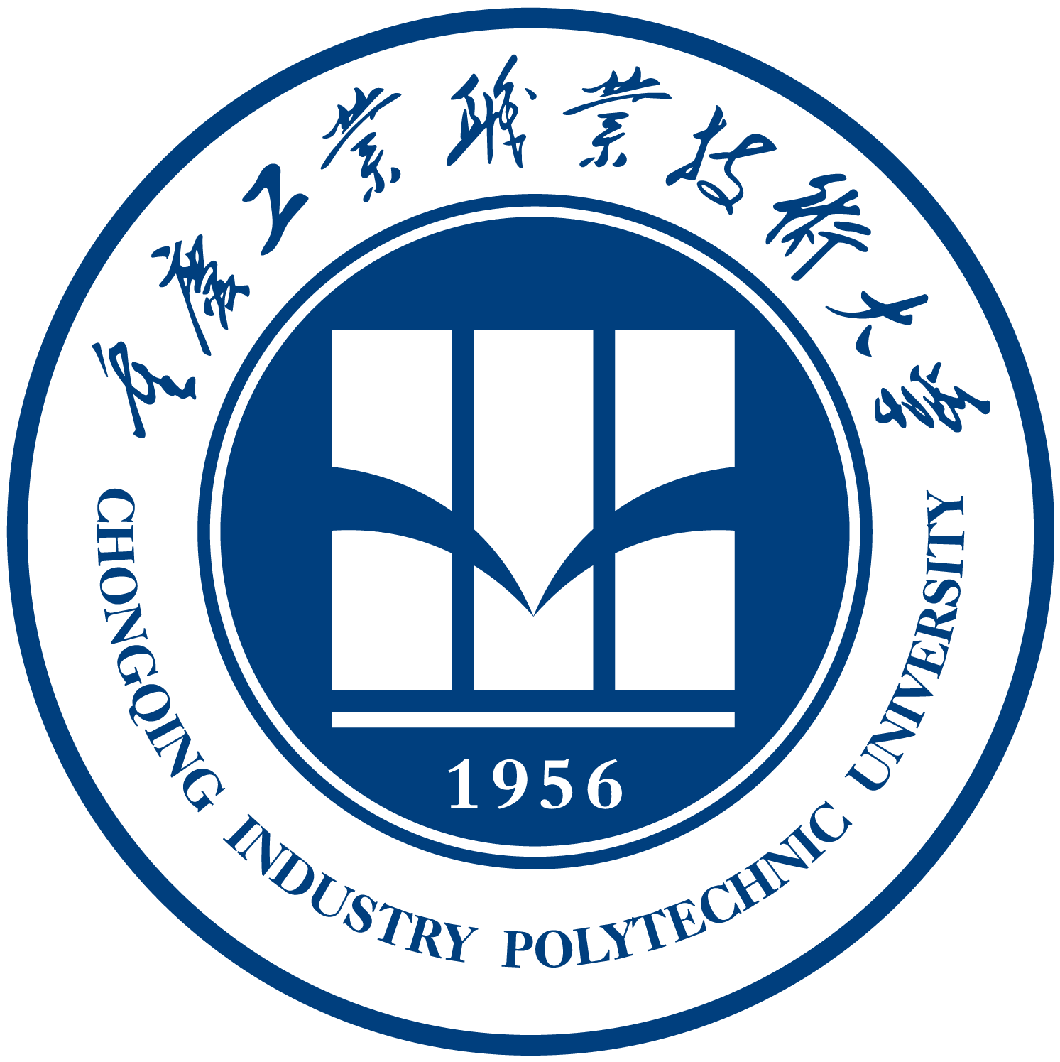 设计说明:以中对齐标识图形和学校中英文全称,视觉均衡,设计简洁大方,色彩明快,视觉传达效果佳。校旗设计与重庆工业职业技术大学工学概念相吻合,充分体现学校办学理念上的色彩属性——严谨、宽广、理性、求实。